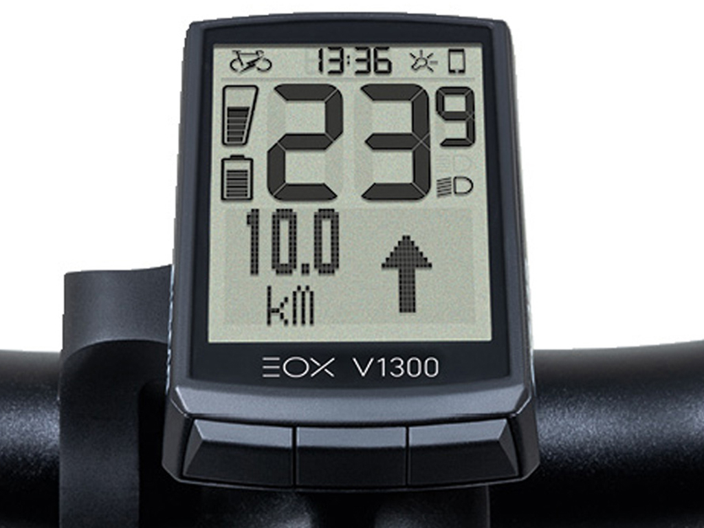 The wireless EOX® VIEW 1300 fits discreetly into the overall appearance of the e-bike with its flat design and ensures a tidy cockpit. It is equipped with a long-life battery. This allows it to be rotated out of the mount like a regular bike computer. Secure data connection is ensured by the high-performance ANT+ and Bluetooth interface. With 3 buttons on the bottom, the e-bike computer is easy to use. The transflective FSTN display ensures best readability even in direct sunlight. An integrated sensor automatically adjusts the display illumination to the ambient light.